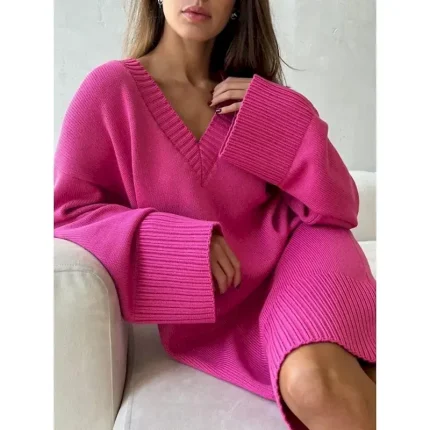 Women’s Sweater Sweater Dress Casual Soft Pure Color Ribbed V Neck Knitted Long Sleeve Long Tops Knit Outdoor Daily Weekend Black Fuchsia Fall Winter
