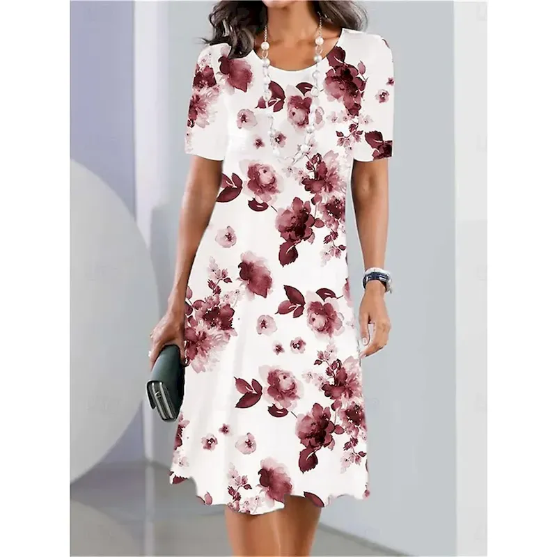 Women’s Elegant Party Evening Midi Dress Crew Neck Short Sleeve Casual Dress Shift Dress Summer Dress Stylish Formal Work Casual Regular Fit Floral Black And White Red Blue Purple