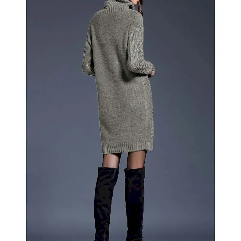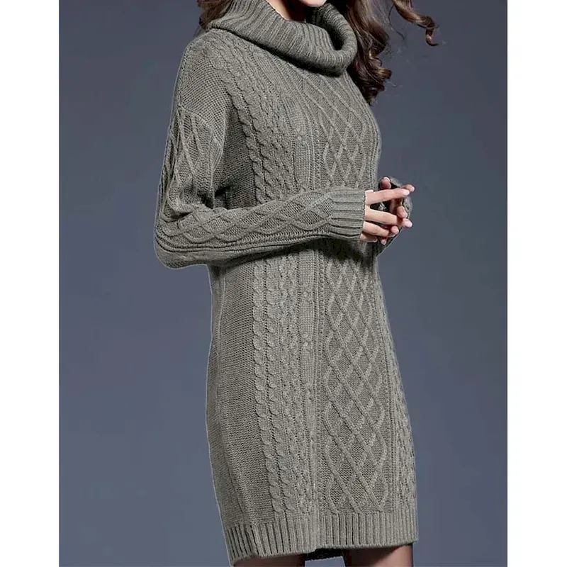 [Design Highlights]: This sweater dress boasts a classic cable knit pattern, adding rich texture and a timeless look. The turtleneck design elevates its style, while the ribbed cuffs and hem ensure a snug finish.