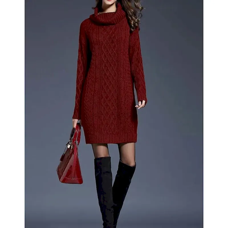 Women’s Sweater Dress Casual Soft Pure Color Cable Turtleneck Knitted Long Sleeve Long Tops Knit Outdoor Daily Weekend White Wine Fall Winter